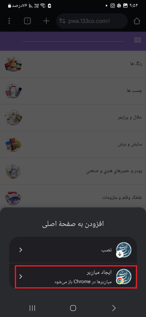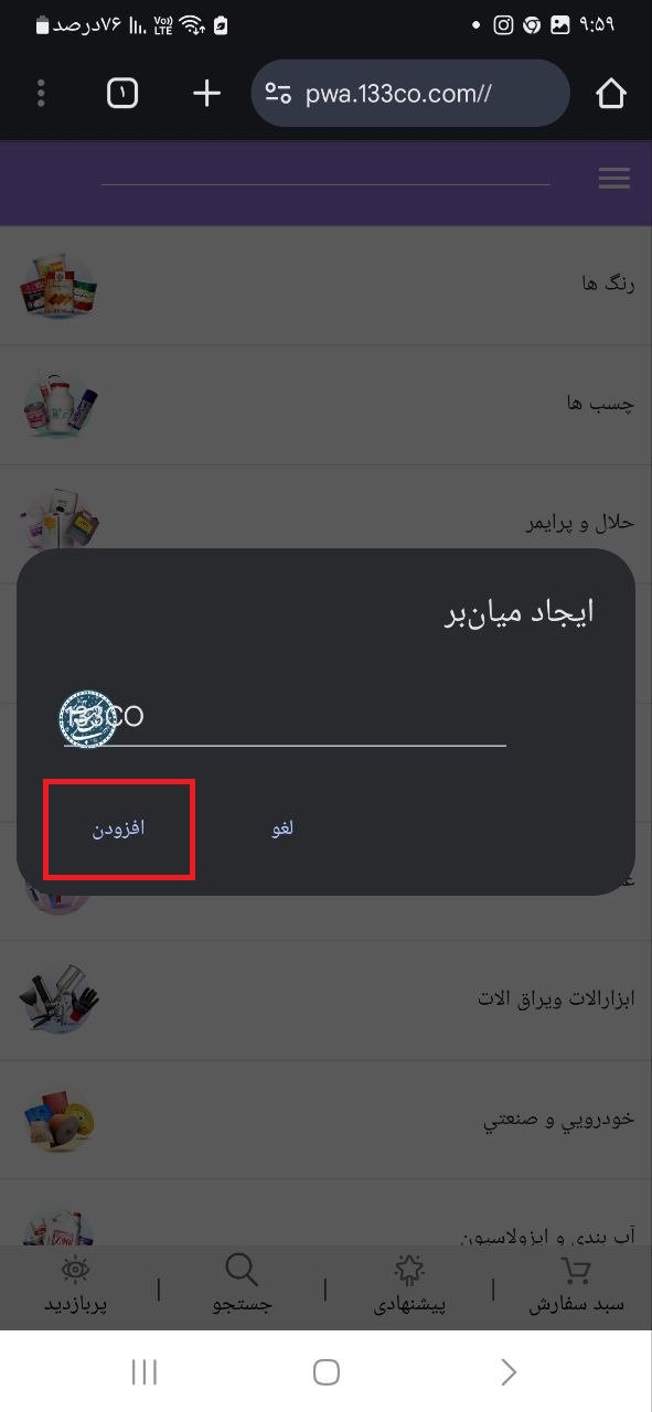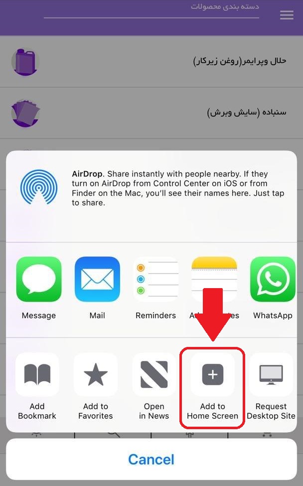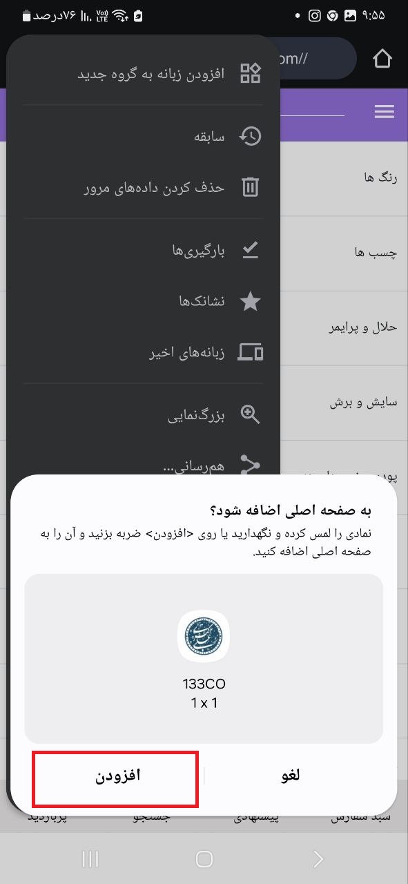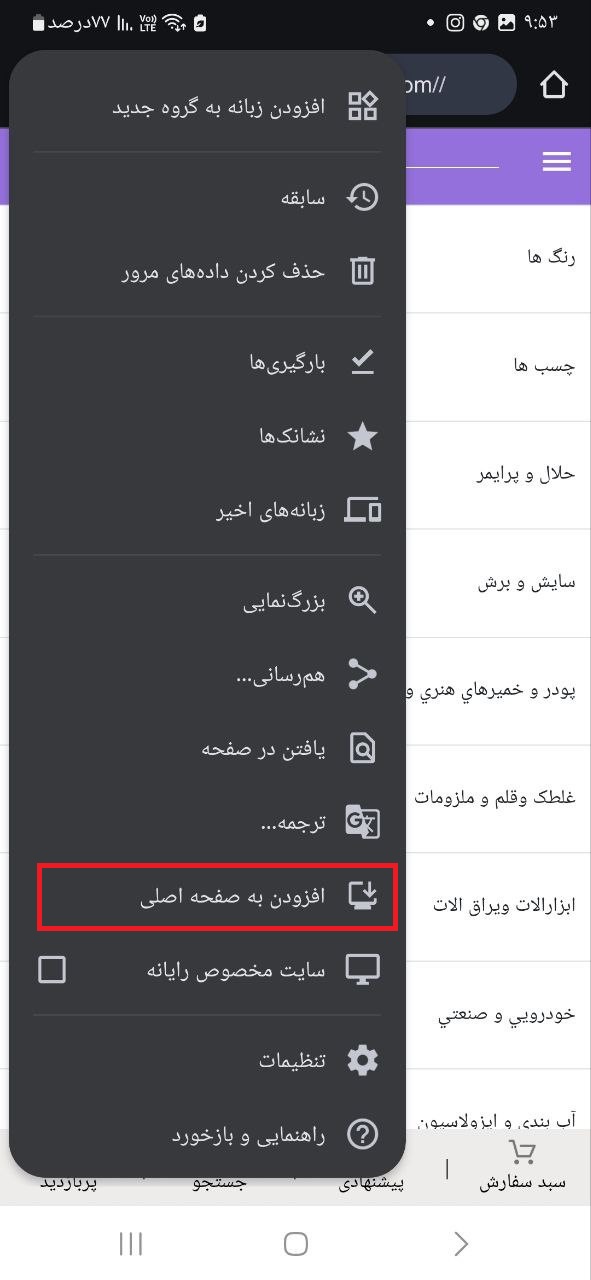 حال گزینه "افزودن به صفحه اصلی" (Add to home screen) را انتخاب نمایید